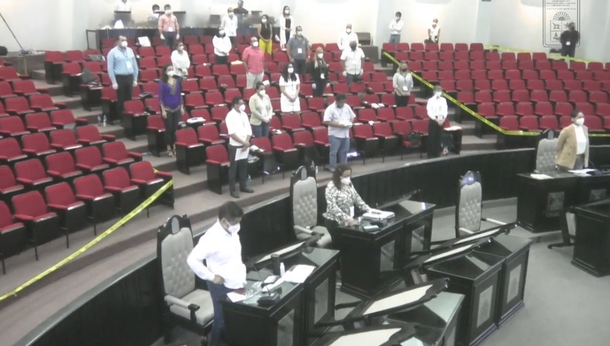 No solo ocuparon las curules, sino también la zona de las butacas para respetar la sana distancia;  en tribuna solo el presidente de la Mesa Directiva, Gustavo Miranda García.