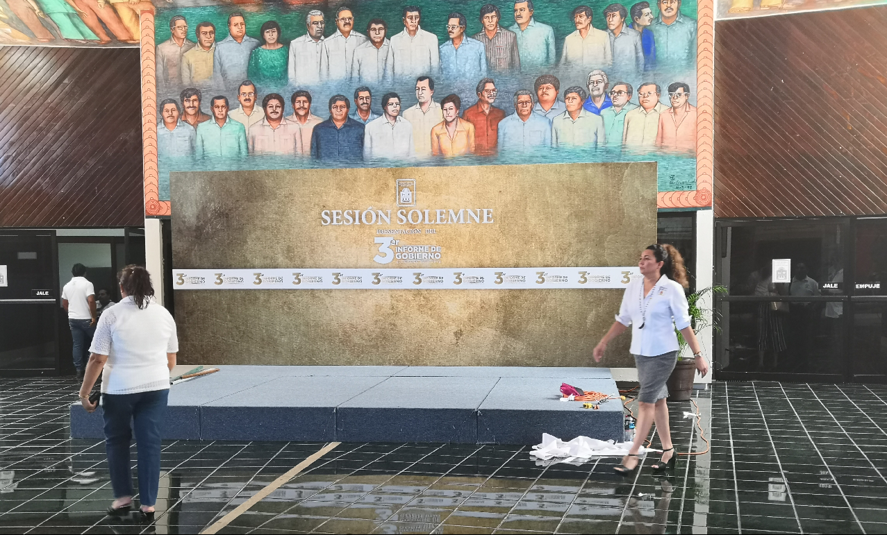 La pantalla LED instalada el pasado martes en el vestíbulo para transmitir la instalación de la XVI Legislatura, fue retirada y en su lugar se colocó un pequeño escenario con la leyenda: “Sesión Solemne Presentación del Tercer Informe de Gobierno”.