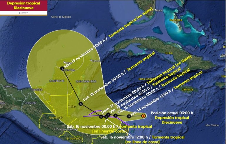 CANCÚN, QR.- Una depresión tropical, denominada “Diecinueve,” continúa su recorrido en el mar Caribe, aproximándose a las costas de Quintana Roo y afectando su clima. Se espera que este sistema meteorológico se fortalezca en el transcurso del día, alcanzando la categoría de tormenta tropical bajo el nombre de “Sara” después del mediodía, de acuerdo con información de la Coordinación Estatal de Protección Civil.