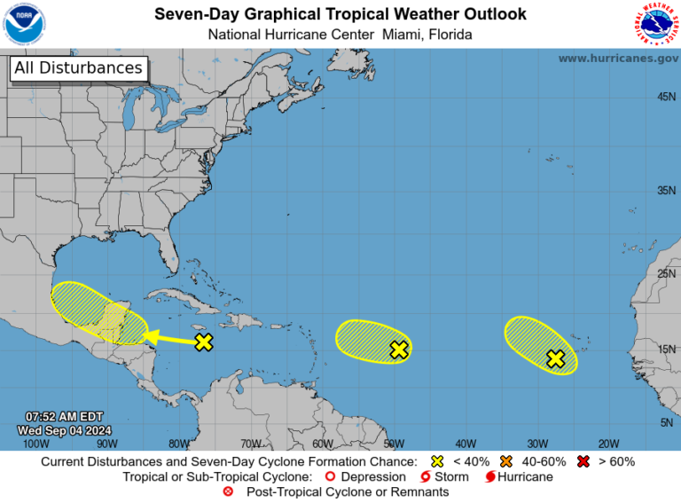 Una onda tropical que se mueve rápidamente hacia el oeste a una velocidad de 20 mph se encuentra sobre el sureste de Cuba, Jamaica y el Mar Caribe central. Este sistema está generando tormentas desorganizadas. Se espera que las condiciones sean más favorables para el desarrollo hacia el final de esta semana o principios de la próxima en el suroeste del Golfo de México. La probabilidad de formación ciclónica en las próximas 48 horas es prácticamente nula, con un 0%, mientras que en los próximos siete días, la probabilidad se eleva a un 30%.