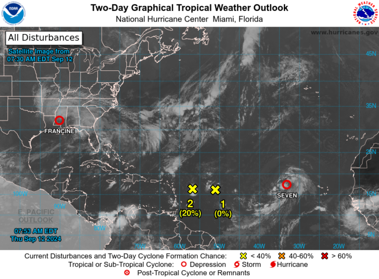 El Centro Nacional de Huracanes continúa monitoreando varios sistemas tropicales en el Atlántico Norte, el Mar Caribe y el Golfo de México. Actualmente, se emiten advertencias sobre dos depresiones tropicales activas: la Depresión Tropical Francine, que se encuentra en tierra sobre el centro-sur de Mississippi, y la Depresión Tropical Siete, que se ubica sobre el Atlántico este.