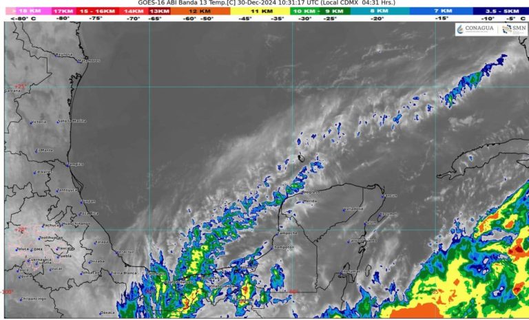 La Comisión Nacional del Agua reporta que el ingreso de aire húmedo procedente del golfo de México y el mar Caribe continuará generando lluvias en la península de Yucatán. Campeche y Quintana Roo se verán afectados por intervalos de chubascos, mientras que en Yucatán se esperan lluvias aisladas.