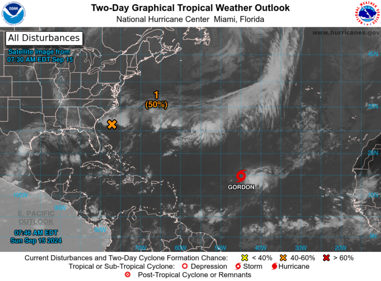 El Centro Nacional de Huracanes mantiene advertencias activas sobre la Tormenta Tropical Gordon, localizada en el Atlántico tropical central. Mientras tanto, en el mar adyacente a la costa sureste de Estados Unidos, una baja presión no tropical se desplaza a lo largo de un frente que se encuentra a cientos de millas de la costa. Este sistema genera vientos con fuerza de vendaval al norte de su centro, mientras avanza hacia el noroeste o norte sobre las aguas cálidas de la Corriente del Golfo.