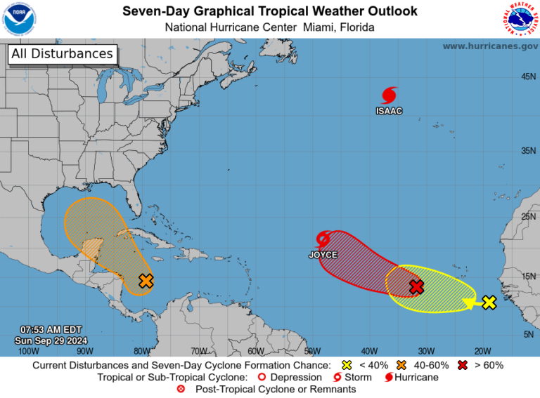 El Centro Nacional de Huracanes ha emitido advertencias sobre dos sistemas activos en el Atlántico. El huracán Isaac se encuentra al noroeste de las Azores, mientras que la tormenta tropical Joyce avanza sobre el Atlántico central.