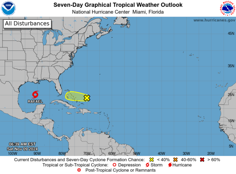 El Centro Nacional de Huracanes del Servicio Nacional de Meteorología en Miami ha informado sobre las condiciones actuales en el Atlántico Norte, el Mar Caribe y el Golfo de México para la mañana de este sábado 9 de noviembre de 2024.