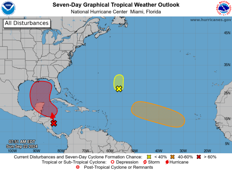 Mientras tanto, en el noroeste del Mar Caribe y el Golfo de México, un amplio sistema de baja presión está generando lluvias y tormentas eléctricas desorganizadas en la región occidental del Caribe y partes de América Central. Las condiciones son propicias para el desarrollo gradual de este sistema, lo que podría llevar a la formación de una depresión tropical hacia el final de la semana. Aún sin su desarrollo, se esperan fuertes lluvias en América Central. La probabilidad de formación en 48 horas es baja, con un 10 %, mientras que en los próximos 7 días aumenta significativamente al 70 %.