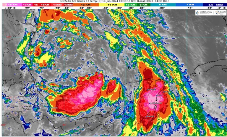 La entrada de humedad proveniente del Mar Caribe y la vaguada monzónica sobre el sur de la Península de Yucatán mantendrán lluvias intensas en Quintana Roo y Campeche, y lluvias muy fuertes en Yucatán. El clima adverso incluye rachas de viento de 50 a 70 km/h y posible formación de trombas marinas en las costas de la región. Oleaje de 1 a 3 metros de altura en Yucatán y Quintana Roo.