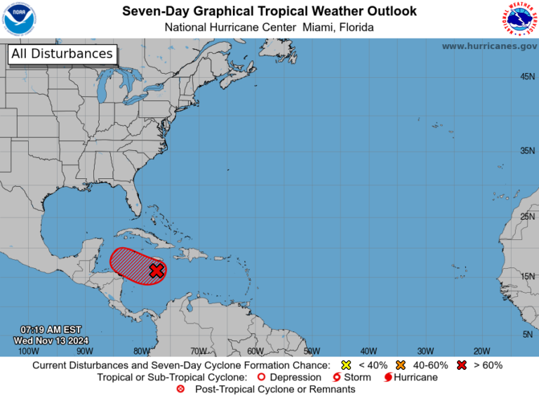El Centro Nacional de Huracanes de Miami estima una probabilidad de formación de depresión tropical alta, con un 90% de posibilidades tanto en las próximas 48 horas como en el plazo de siete días.
