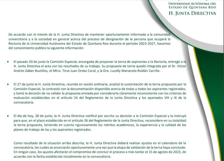 Aunque de acuerdo con el máximo órgano de gobierno de la Uqroo, una semana después, el 27 de junio, los integrantes se reunieron para valorar los perfiles y encontraron “claras inconsistencias con los criterios de evaluación”.