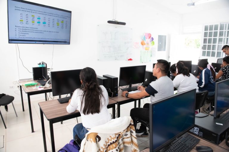 Los maestros imparten clases desde Cancún, pero el sistema está conectado en los cuatro centros, donde los jóvenes reciben clases virtuales y son acompañados por un asesor de manera presencial.