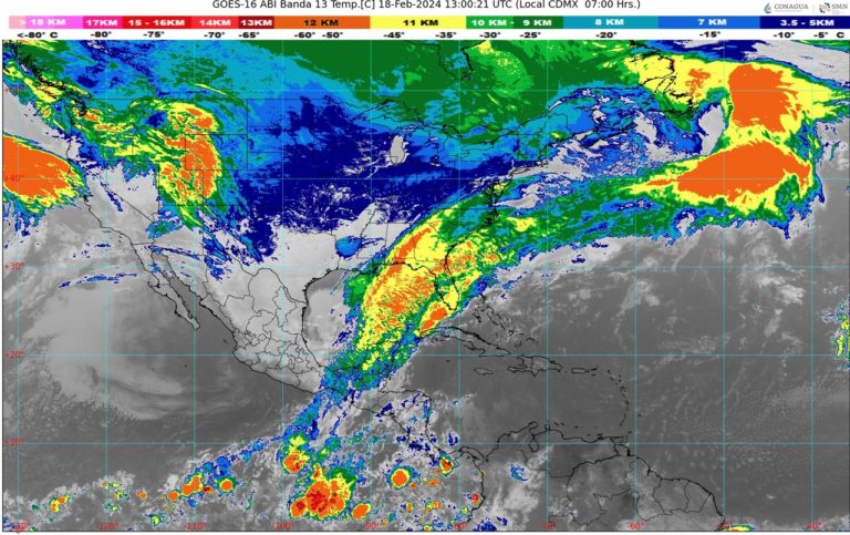 El pronóstico de lluvias para este 18 de febrero de 2024 será de intervalos de chubascos con lluvias puntuales fuertes (25 a 50 milímetros) en Campeche, Yucatán y Quintana Roo.