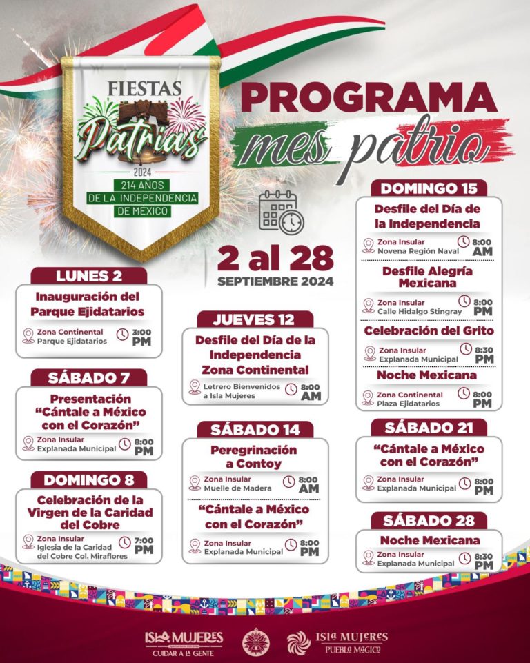Entre los eventos destacados se encuentran el desfile del Día de la Independencia en la Zona Continental el 17 de septiembre a las 08:00 horas y una peregrinación a Contoy el 14 de septiembre. También se llevará a cabo el tradicional Grito de Independencia el 15 de septiembre a las 20:30 horas en la Explanada Municipal, acompañado de una Noche Mexicana en la Plaza Ejidatarios de la Zona Continental.