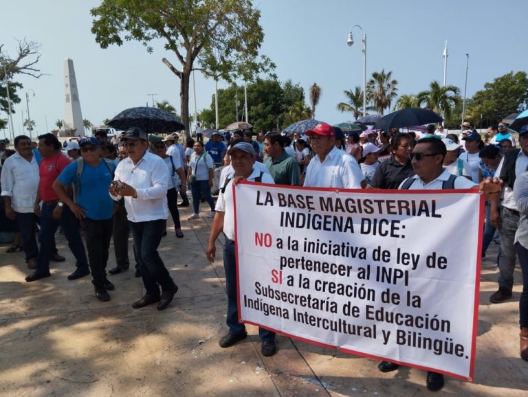 CHETUMAL, QR.- Más de 200 maestros de educación indígena se manifestaron una vez más en esta ciudad. Insisten en no ser incorporados al Instituto Nacional de los Pueblos Indígenas (INPI).