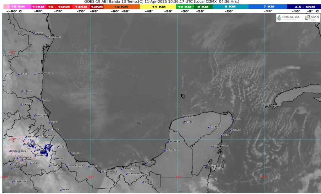 CANCÚN, QR.- La Comisión Nacional del Agua reporta que este viernes 11 de abril, se espera cielo parcialmente nublado y ausencia de lluvias en los tres estados que integran la península de Yucatán. Las condiciones meteorológicas contemplan un ambiente fresco por la mañana, templado en zonas costeras y con formación de neblinas en esas áreas. Durante la tarde, se pronostican temperaturas cálidas.
