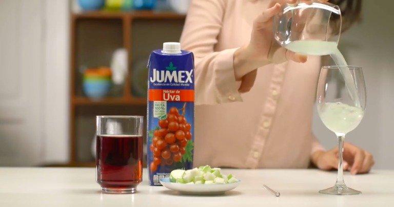 Cada envase de Jumex de uva contiene 215 calorías. Según la NOM-051 de etiquetado de alimentos y bebidas, este valor excede significativamente los límites permitidos.