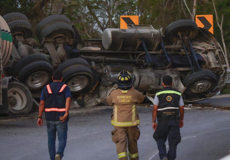 Cancún QR.- El accidente de una pipa con doble remolque que transportaba 64 mil litros de turbosina en el distribuidor vial al Aeropuerto generó una serie de maniobras para retirar los escombros y remolcarla.
