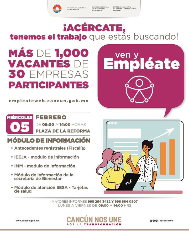CANCÚN, QR.- La Dirección General de Desarrollo Económico del municipio de Benito Juárez llevará a cabo la segunda edición de Ven y Empléate Itinerante este miércoles 5 de febrero del 2025.