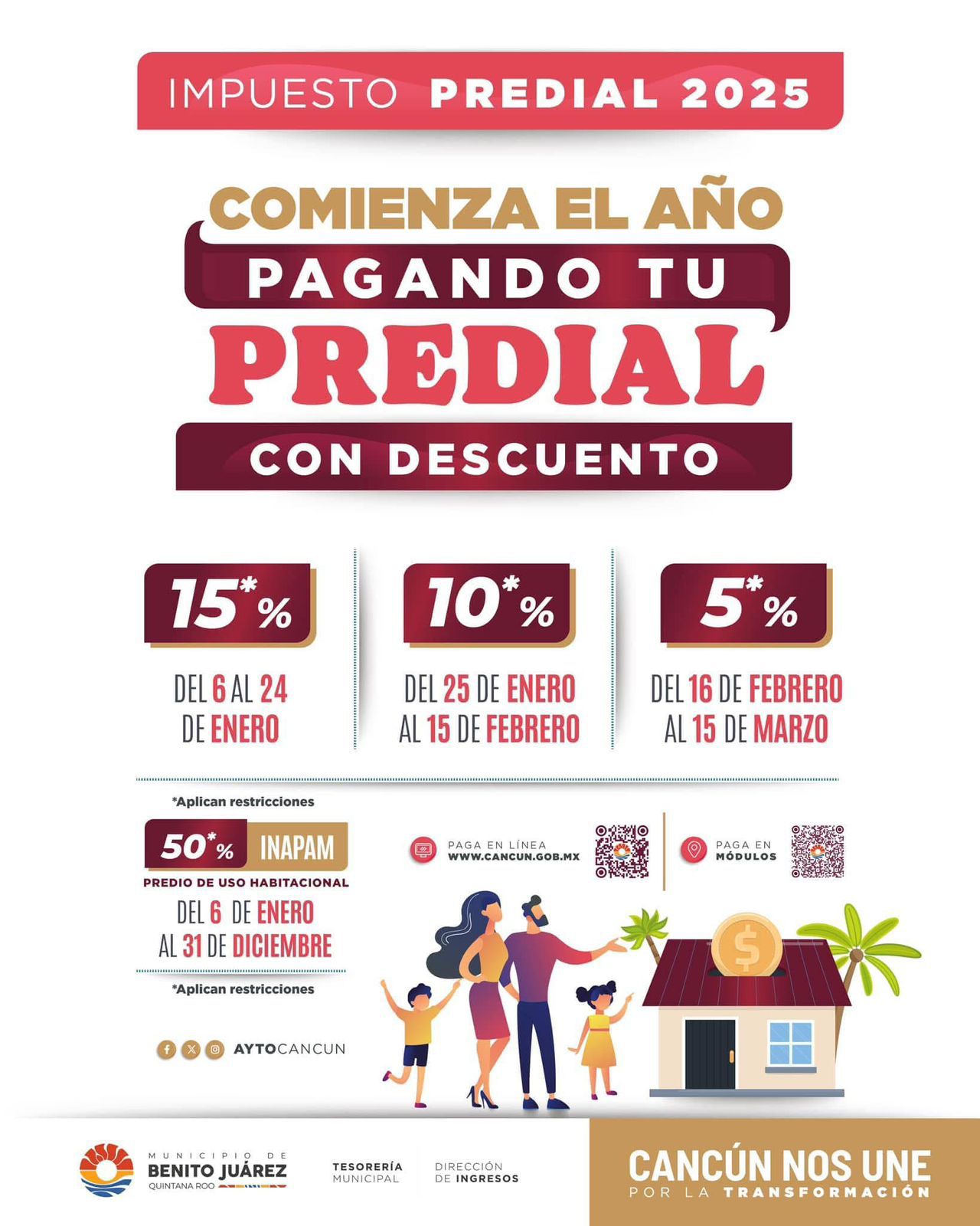 CANCÚN, QR.- El Ayuntamiento de Cancún informó que la segunda fase de descuentos en el pago del predial concluirá el sábado 15 de febrero. Durante este periodo, los contribuyentes pueden obtener un 10 % de descuento al realizar el trámite en cualquiera de los módulos habilitados o a través del sitio web oficial www.cancun.gob.mx.