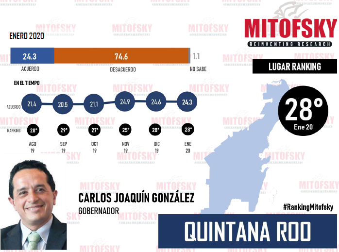 En el #RankingMitofsky“, el gobernador quintanarroense ha permanecido en el lugar 28 en agosto y diciembre de 2019, mientras que en septiembre de 2019, se ubicó en el lugar 29.