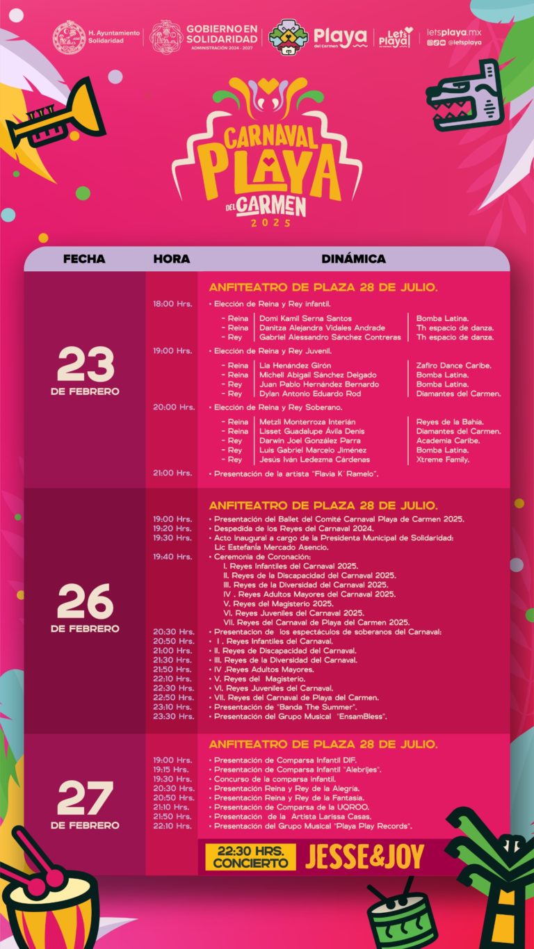 El programa contempla el inicio de actividades el miércoles 26 de febrero a las 19:30 horas con la inauguración y la coronación de los soberanos del carnaval. Previo a ello, el Ballet del Comité de Carnaval de Playa del Carmen 2025 abrirá la jornada con su espectáculo, seguido de la despedida de los Reyes del Carnaval 2024. Posteriormente, los nuevos reyes presentarán sus números y la noche cerrará con las actuaciones de Banda The Summer y EnsamBless.