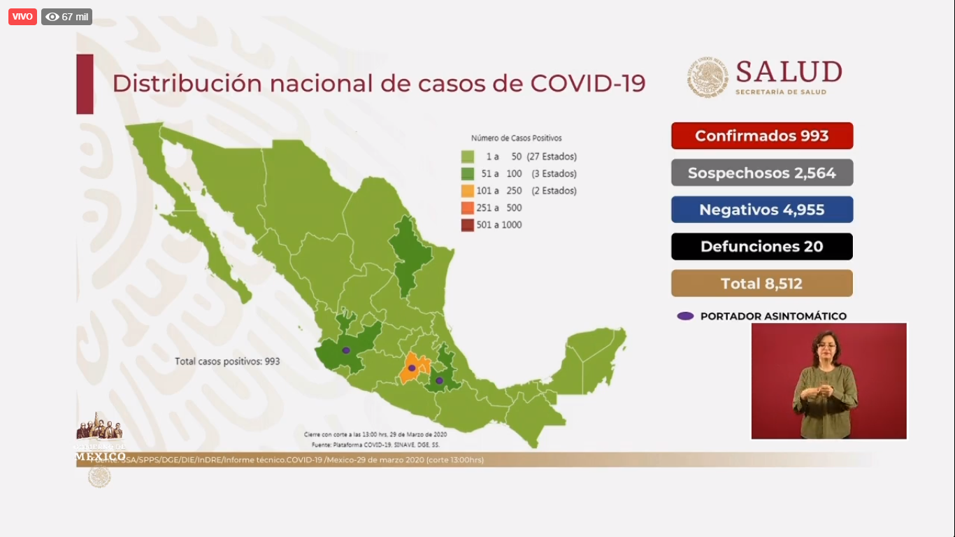 CANCÚN, QRoo.- En una apurada conferencia de prensa en Palacio Nacional, con cambios en los formatos de presentación, entre los que se eliminó el de defunciones por entidad federativa, el total de casos positivos por Covid-19 llegó a 993, con 20 defunciones.