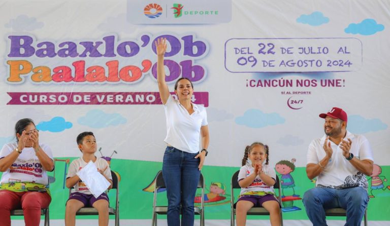 CANCÚN, QR.- La presidenta municipal, Ana Paty Peralta de la Peña, reafirmó su compromiso de promover una niñez sana, en comunidad y alejada de la delincuencia, en beneficio de un Cancún de paz, durante las clausuras de los cursos Baaxlo’Ob Paalalo’Ob 2024 y Verano Seguro, Policía 2024, en los que participaron un total de 342 niños, niñas y jóvenes durante el periodo vacacional.