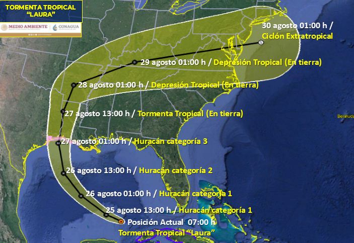 En su aviso de las 7:15 de la mañana, el SMN, informa que el centro de la Tormenta Tropical “Laura” se localiza al noroeste de Cabo San Antonio, a 235 kilómetros del oeste de la Isla de Cuba y a 215 kilómetros al nor-noreste de Cabo Catoche, Quintana Roo.