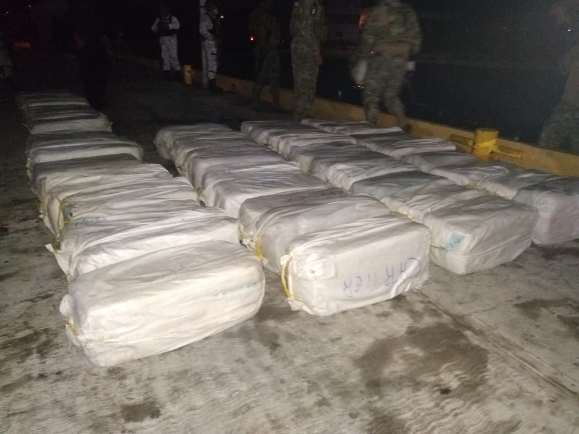 Al revisar la embarcación se hallaron 74 bultos blancos con 40 ladrillos con un peso aproximado de dos mil 960 kilogramos de presunta cocaína.