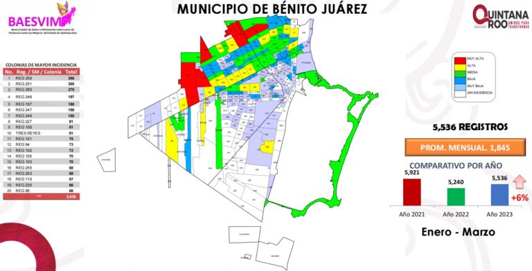 CHETUMAL, QR.- De acuerdo con el Banco Estatal de Datos e Información de Casos de Violencia contra las Mujeres (Baesvim), colonias de los municipios de Benito Juárez, Solidaridad y Othón P. Blanco figuran como las de mayor número de hechos violentos.