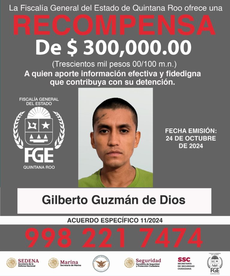 CANCÚN, QR.- La Fiscalía General del Estado lanzó a través de su cuenta de Facebook, FGEQuintanaRoo, una recompensa de 300 mil pesos para quien “aporte información efectiva y fidedigna que contribuya a la localización y detención de la persona identificada como Gilberto Guzmán de Dios”.