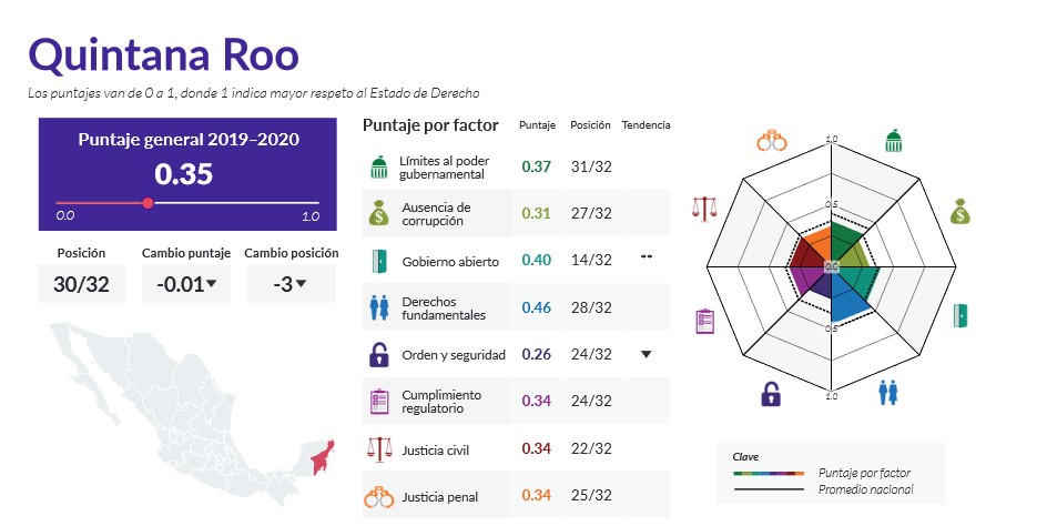 CHETUMAL, QRoo.- Con base en su experiencia y perspectiva, 25 mil ciudadanos y dos mil 600 expertos en temas de justicia determinaron con base en ocho indicadores o factores, el desempeño de 32 entidades de México en el Índice de Estado de Derecho (IED) 2019-2020, en el que Quintana Roo, el estado gobernado por Carlos Joaquín González, ocupó con Puebla y Guerrero las puntuaciones más bajas. Comparativamente con las entidades de la Península de Yucatán (Campeche y Yucatán), Quintana Roo sólo supera en un indicador de los ocho.