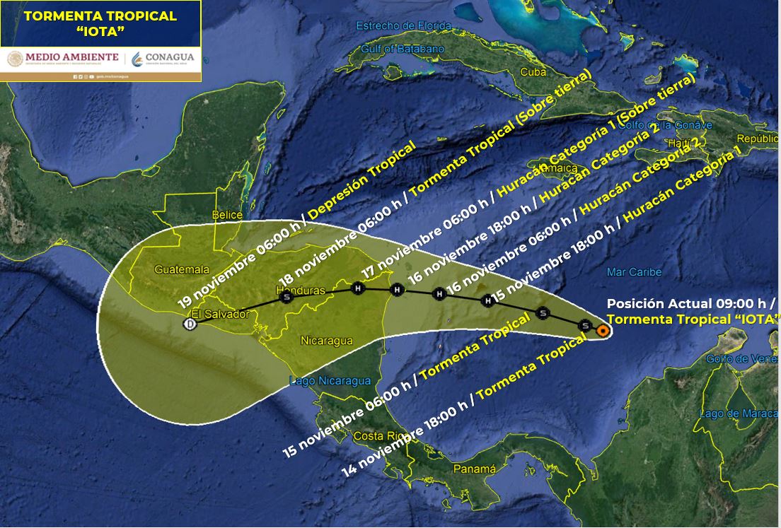 CANCÚN, QRoo.- La Tormenta tropical “Iota” mantiene su desplazamiento hacia el oeste-suroeste, con trayectoria hacia Centroamérica. Se localiza a mil 400 kilómetros al este-sureste de las costas de Quintana Roo y se desplaza a 7 kilómetros por hora, con vientos máximos sostenidos de 65 kilómetros por hora y rachas de 85 kilómetros por hora. No representa peligro para costas nacionales, segú el Servicio Meteorlógico Nacional (SMN).