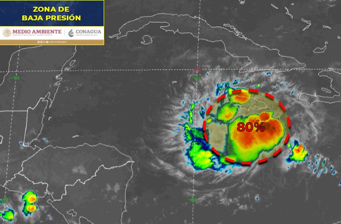 CANCÚN. QRoo.- En su aviso de las 7 de la mañana de hoy, el Servicio Meteorológico Nacional (SMN) informa el desarrollo de una zona de baja presión en el océano Atlántico, entre la isla de Cuba y Centroamérica, con 80 por ciento de probabilidad de desarrollo ciclónico.