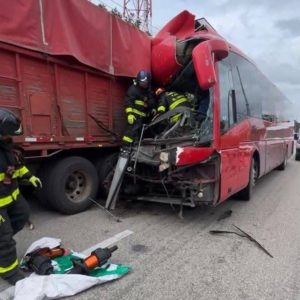 En el tramo carretero Playa del Carmen-Puerto Morelos, un tráiler arroya a una mujer y un autobús se impacta contra él con un saldo de 10 heridos